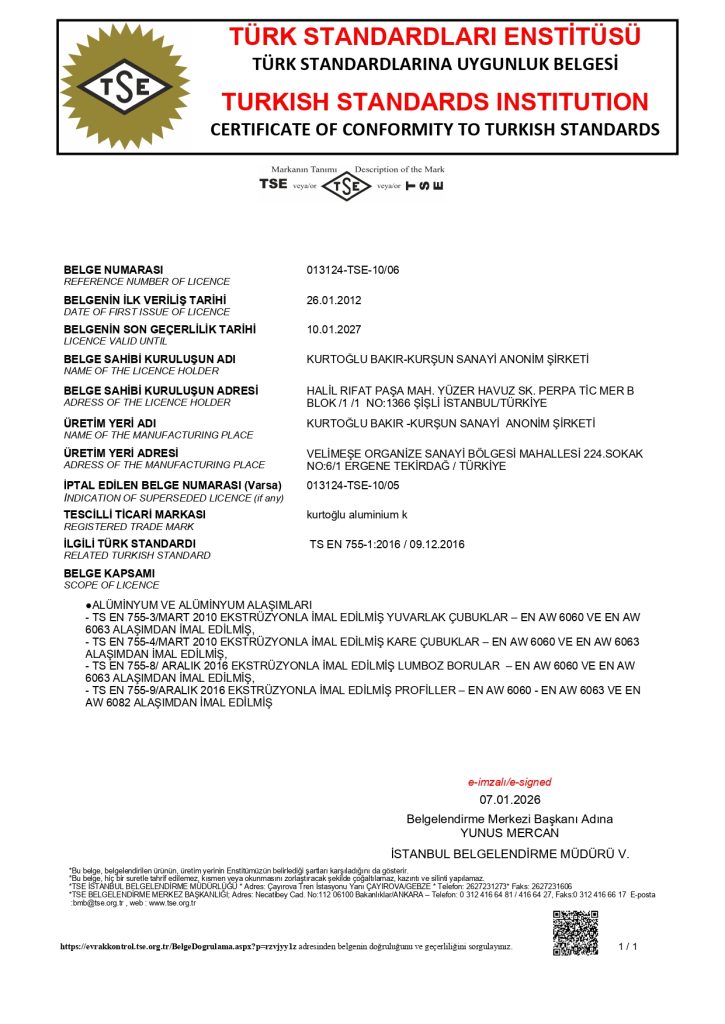 At Kurtoğlu Aluminum, the certifications we hold reflect our commitment to quality and reliability. These certifications document the compliance of our production processes and products with international standards. These certifications demonstrate not only our product quality but also our environmental awareness and commitment to the health and safety of our employees.