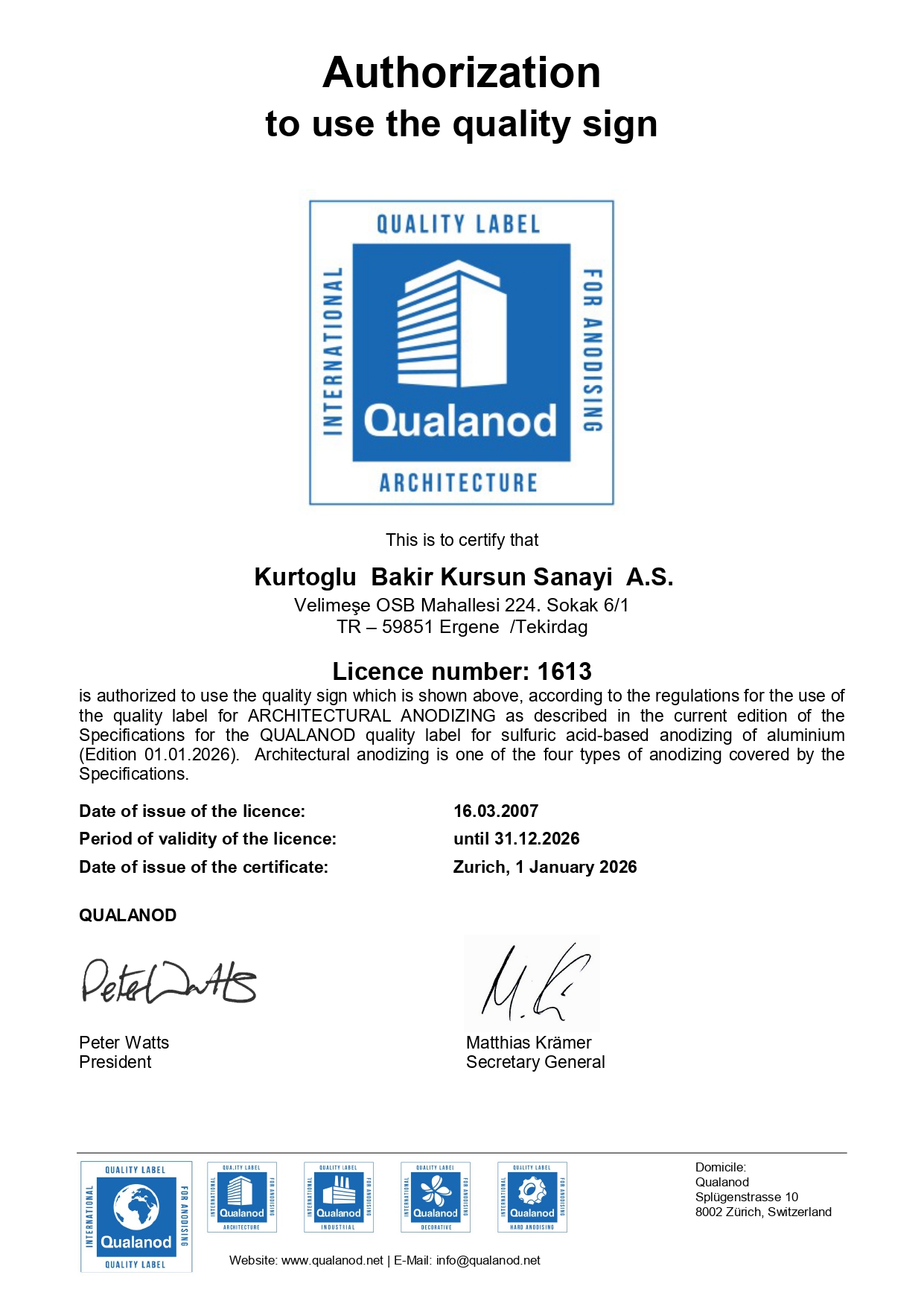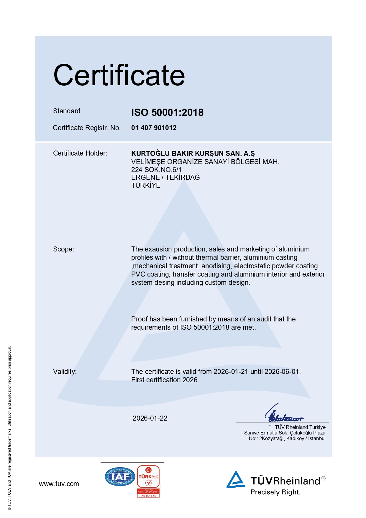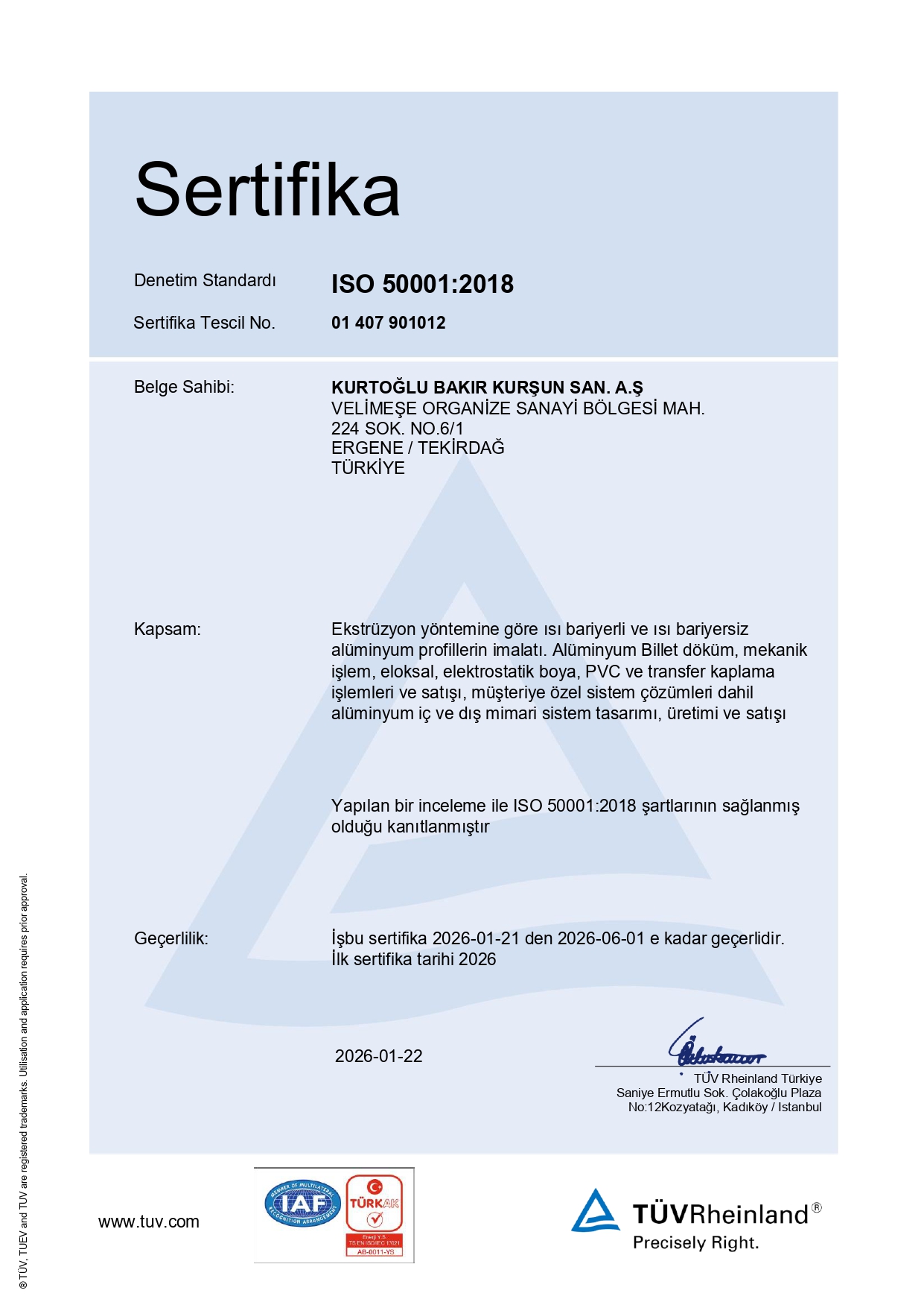 Kurtoğlu Alüminyum olarak sahip olduğumuz sertifikalar, kalite ve güvenilirlik konusundaki taahhüdümüzü yansıtmaktadır. Bu sertifikalar, üretim süreçlerimizin ve ürünlerimizin uluslararası standartlara uygunluğunu belgelemektedir. Sahip olduğumuz sertifikalar, yalnızca ürün kalitemizi değil, aynı zamanda çevre duyarlılığımızı ve çalışanlarımızın sağlığı ve güvenliği konusundaki kararlılığımızı da ortaya koymaktadır.